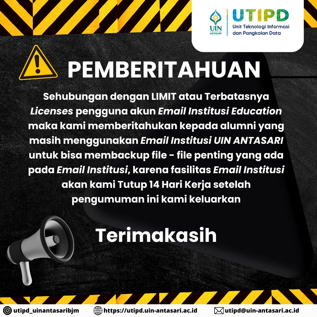 Sehubungan dengan LIMIT atau Terbatasnya Licenses pengguna akun Email Institusi Education @mhs-uin.antasari.ac.id maka kami memberitahukan kepada alumni yang masih menggunakan Email Institusi UIN ANTASARI untuk bisa membackup file – file penting yang ada pada Email Institusi, karena fasilitas Email Institusi …