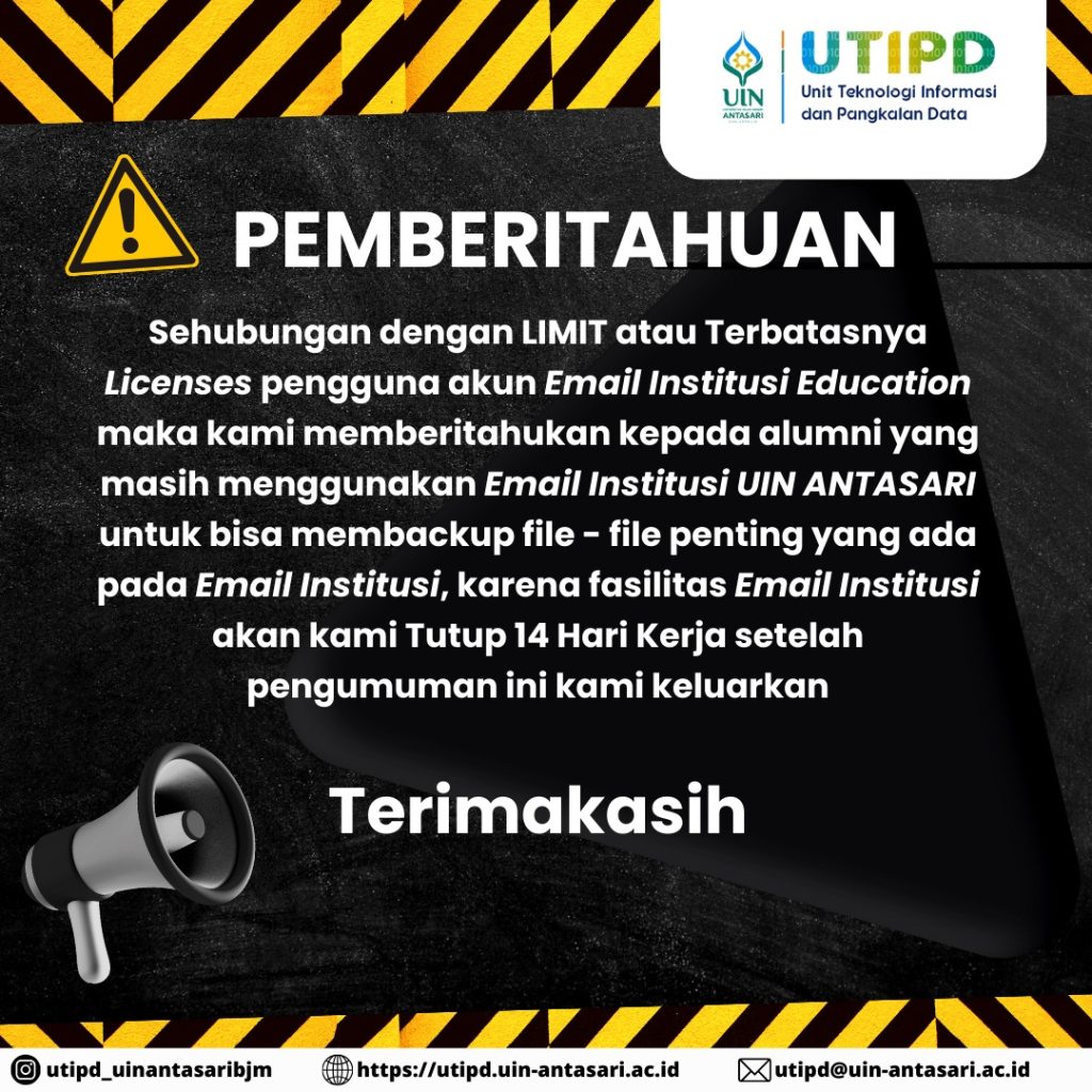 maka kami memberitahukan kepada alumni yang masih menggunakan Email Institusi UIN ANTASARI untuk bisa membackup file – file penting yang ada pada Email Institusi, karena fasilitas Email Institusi akan kami Tutup 14 Hari Kerja setelah pengumuman ini kami keluarkan